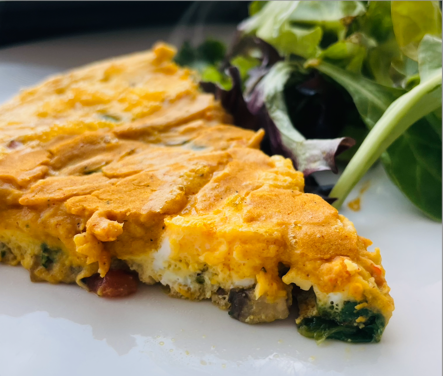 2. Toss in your chopped veggies + protein of choice. If bacon, cook it first and crumble it in.