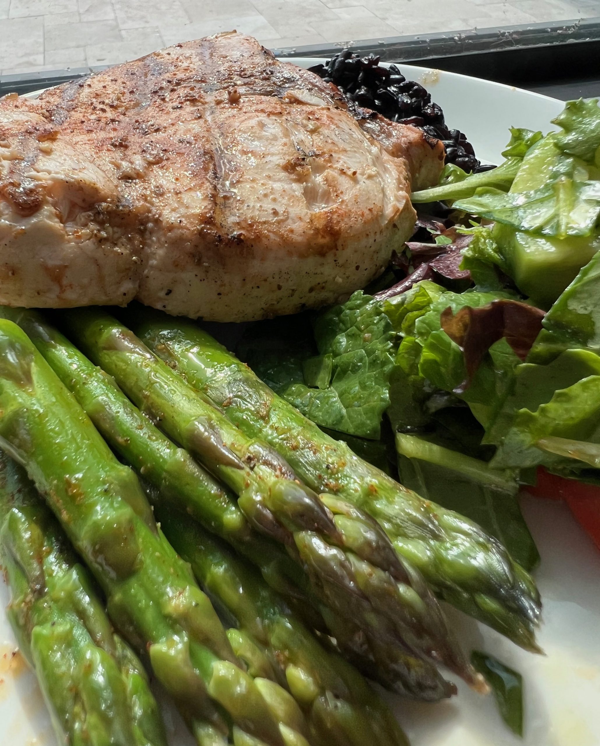 This isn’t your average “fish and veggies” dinner. We’re talking pumpkin swordfish grilled hot and fast at 500°, asparagus wrapped in foil with spice and oil, and a salad that’s so simple you’ll wonder why people complicate it. It’s bold, clean, and loaded with flavor — perfect fuel without feeling like “diet food.”