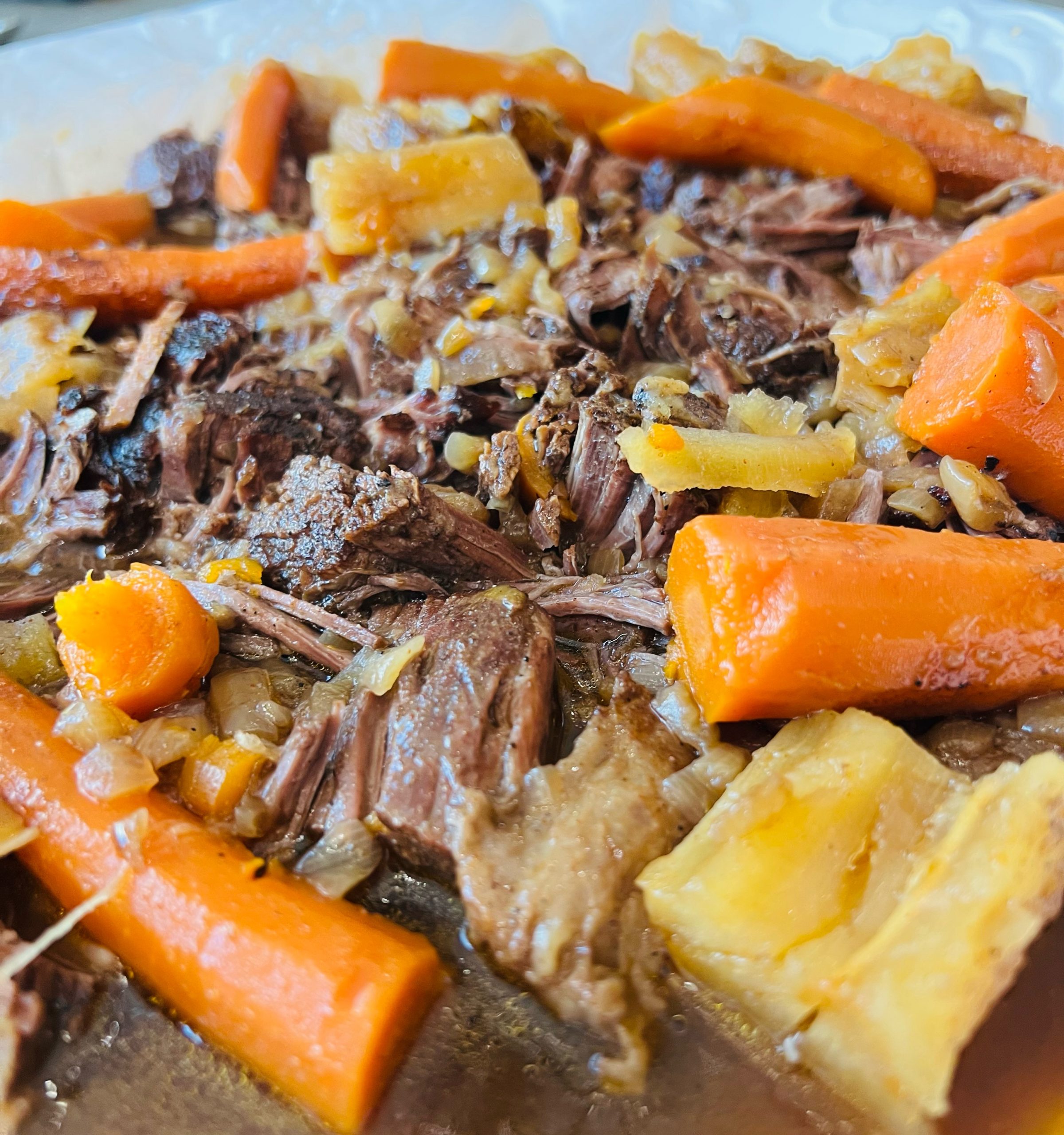 Ok so it’s later ….4 hours later…..take out the chuck roast only and put on a large plate…with a couple forks gently tear that meat apart should just come apart…then add it all back to the meat juice spa where the potatoes and carrots have been patiently waiting to greet the shredded chuck. Now guess what? It’s done and ready to serve.